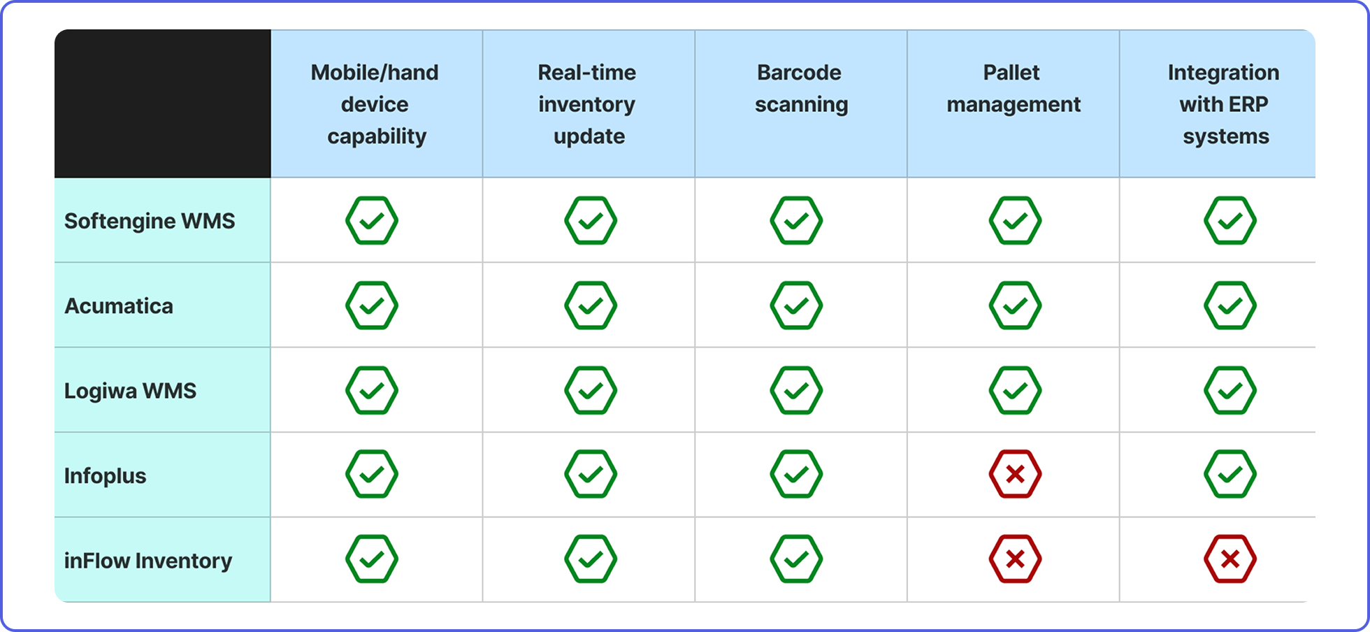 A comparative study of existing mobile-based Warehouse Management Systems (WMS) was conducted before the design phase, focusing on key features relevant to the system being developed by Aliter. Leading WMS platforms such as Softengine WMS+, Infoplus, Logiwa WMS, and others were compared and analyzed based on the features highlighted in the table above.