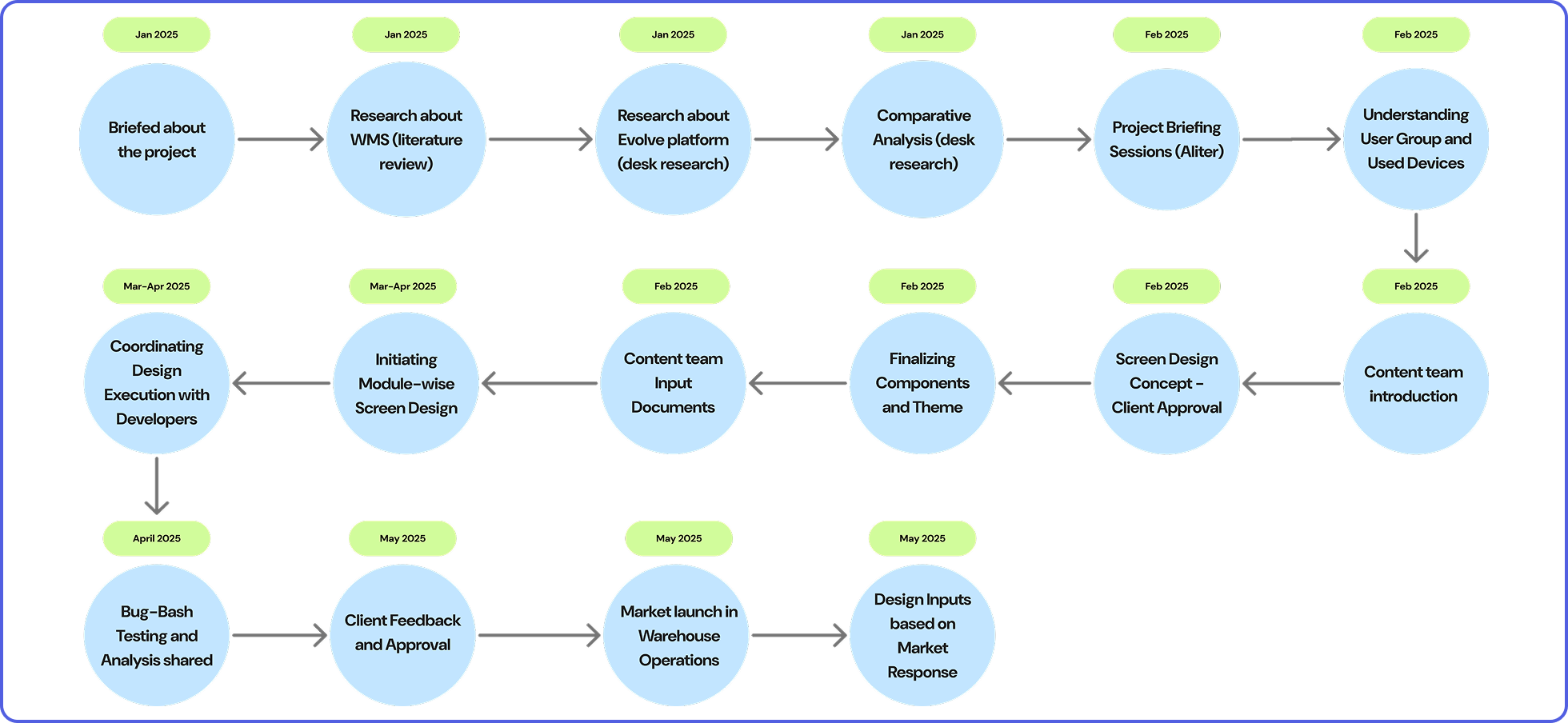 The project was initiated by the last week of January 2025. A project briefing with the project lead and managing director of Aliter gave a heads-up to do a literature review to understand the project. Screen designs and development were done after approval from the client, and the project was presented to the client, ready for warehouse operations, post-bug-bash testing, and project lead approval. The WMS was launched for market operations in May 2025.