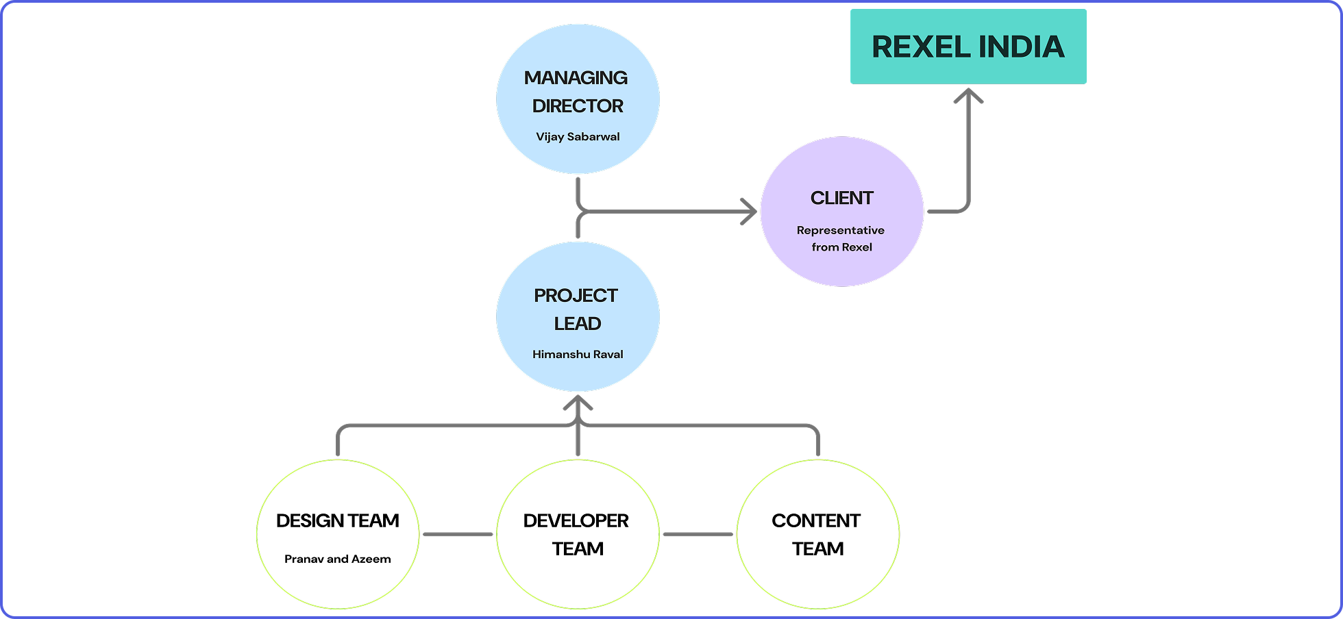 The project followed a structural hierarchy of communication. In this hierarchy flow, the client Rexel is at the top, and the mode of communication to the top follows a process from the working teams to the project lead and the company managing director. The project lead was in charge of supervising all the deliverables of the design, development, and content teams and communicated all the deliverables and developments of the project, along with the managing director, to the representative of Rexel India.